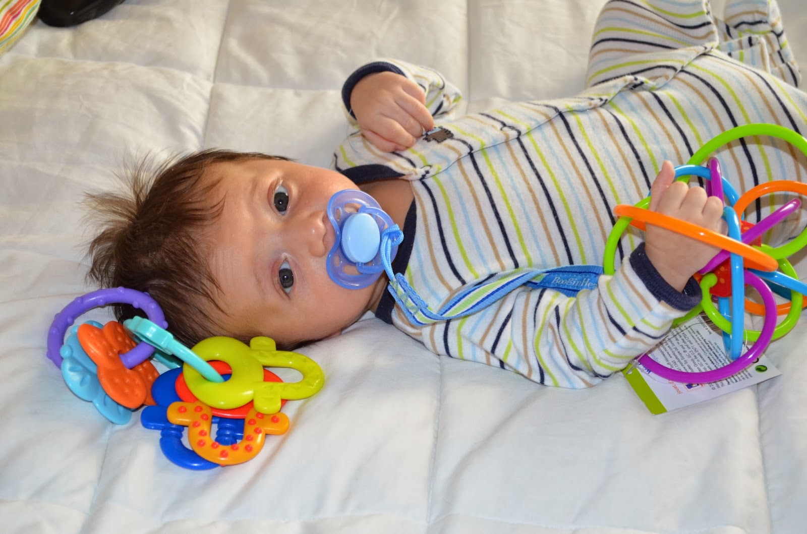 When selecting that first toy for your new arrival, look for something that will really play to all of these primitive senses. My son's favorite toy for his first six month was his ManhattanToy Winkel. We literally did not go anywhere without it. With thin twisting bars, it is easy for a baby's chubby, but soft grip to pick up and hold on to. The soft texture and the structure encourage baby to put the Winkel in their mouth.